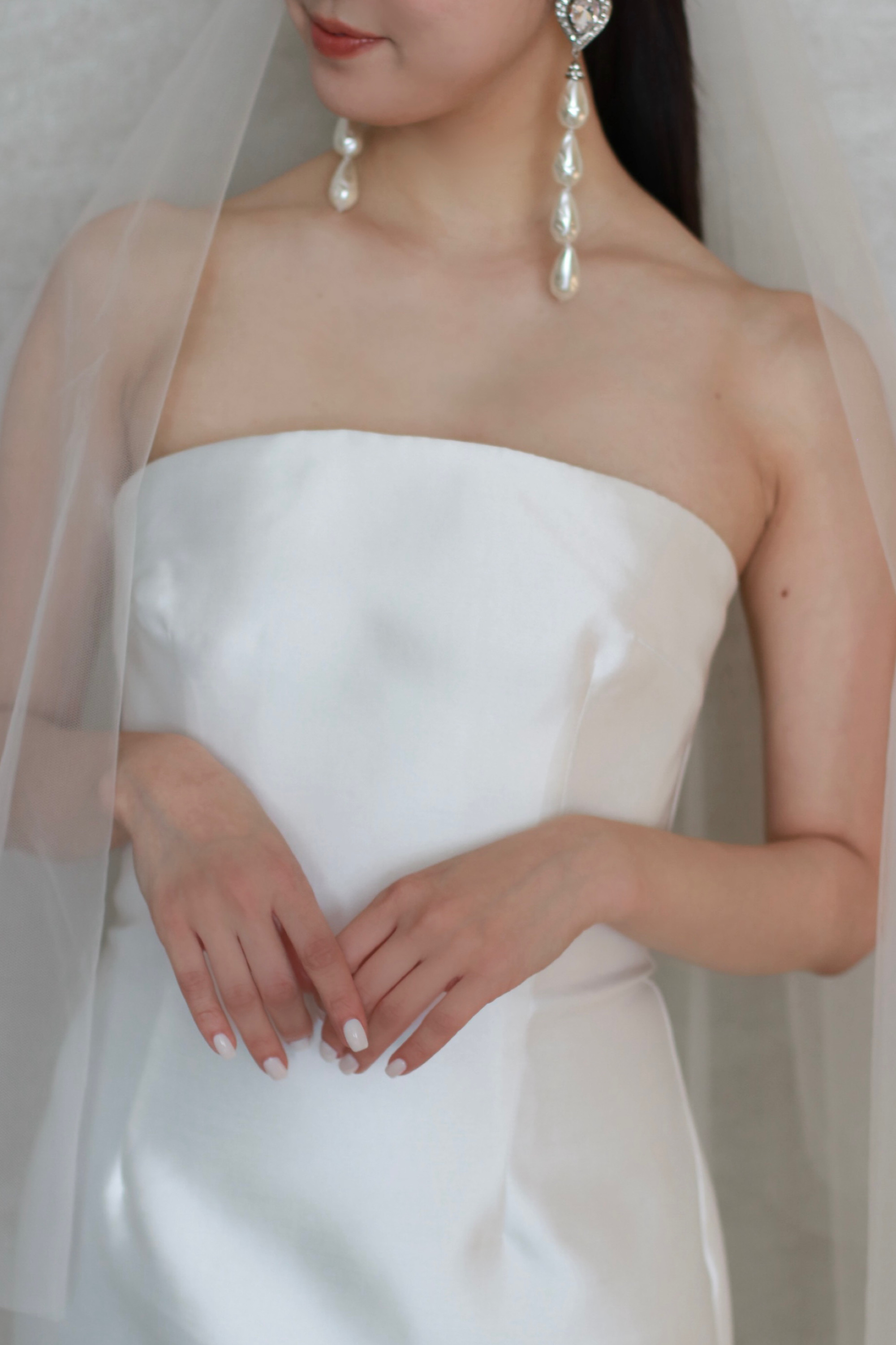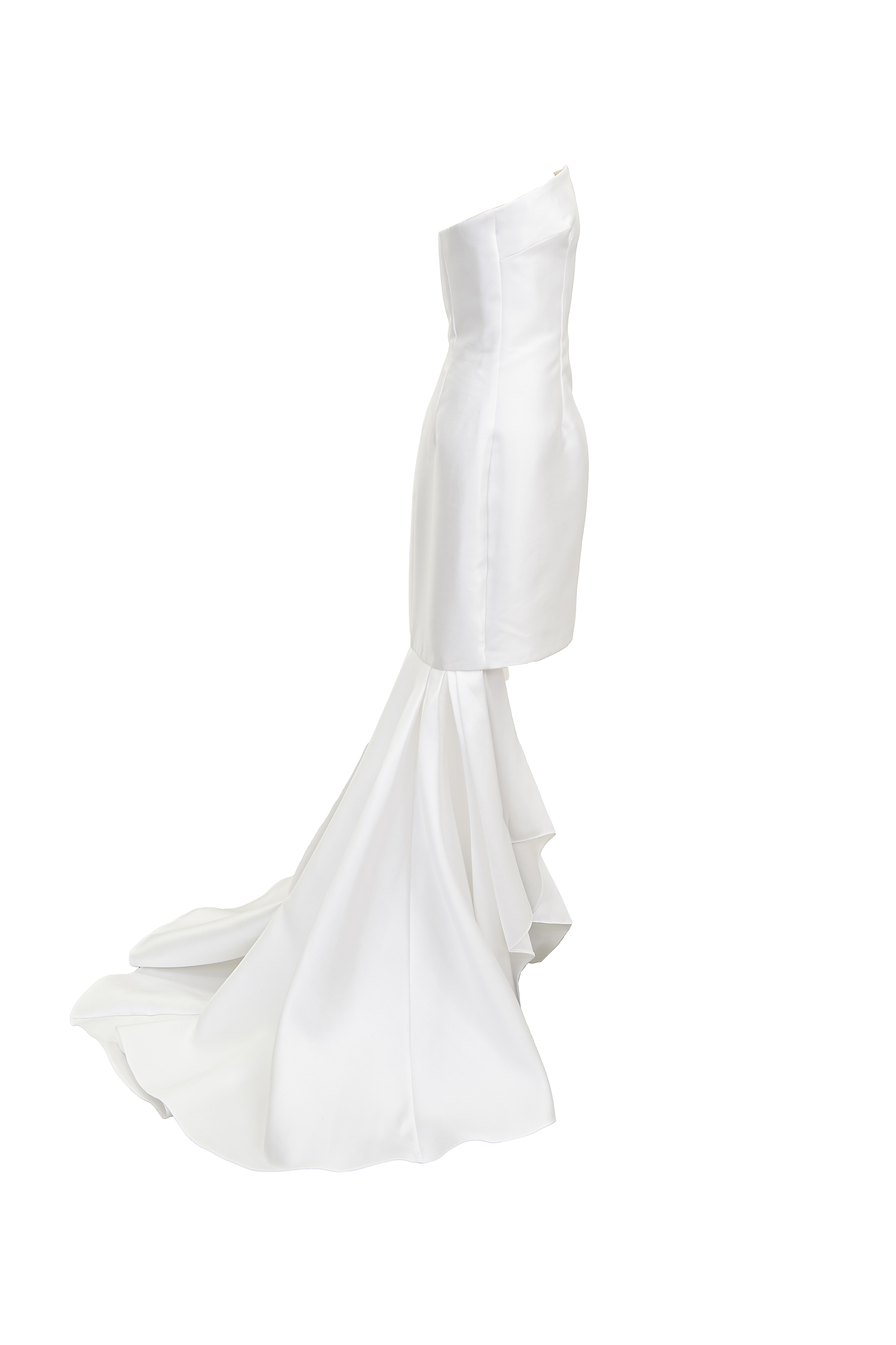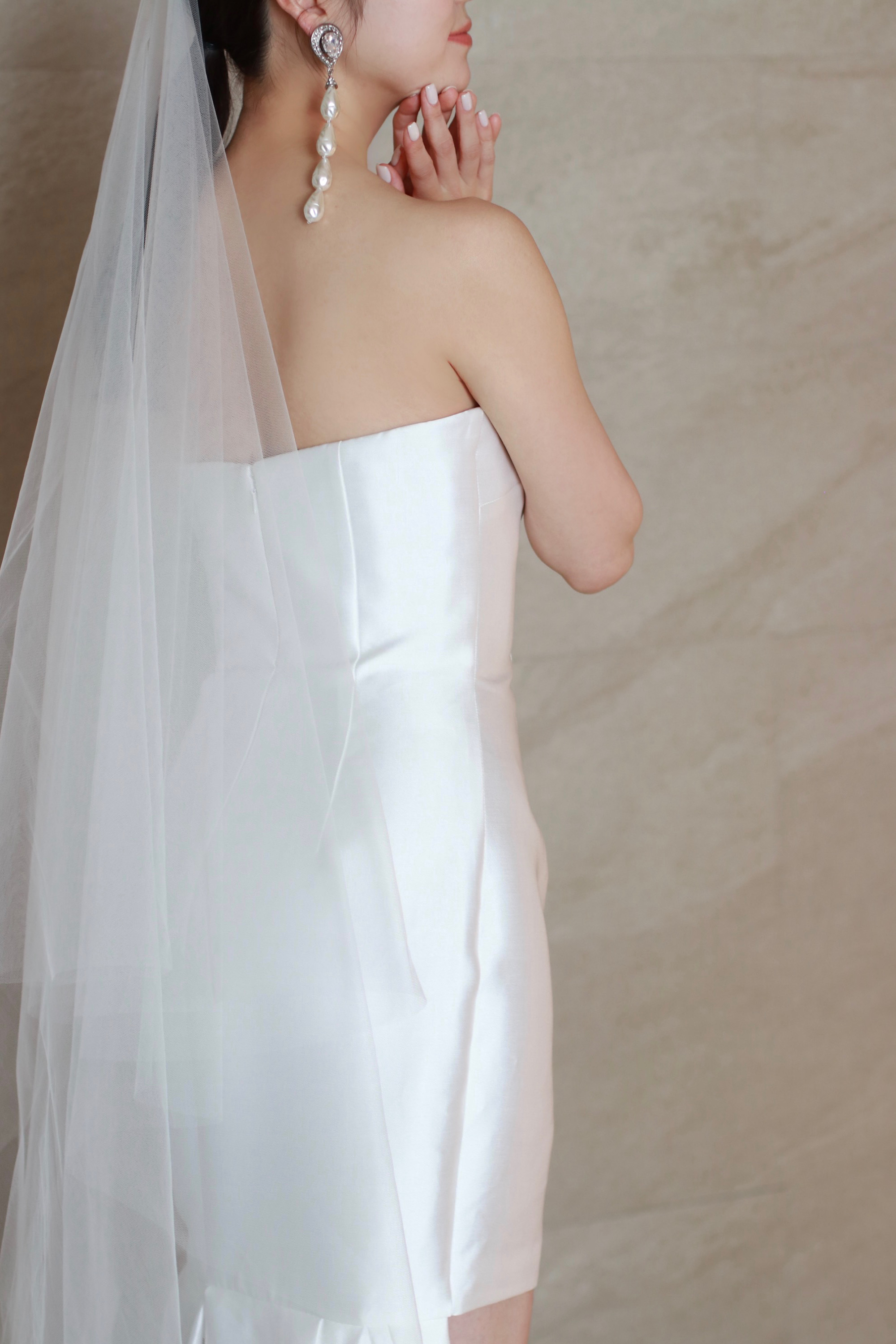 サテンをたっぷりと使用した特別感溢れるブライダルドレス。フロントのミニのデザインとは対照的に、フィッシュテールトレーンの広がりがドレスらしい1着です。ロケーションでの前撮りや2次会でスタイリッシュかつファッショナブルなスタイリングを叶えていただけるはず。