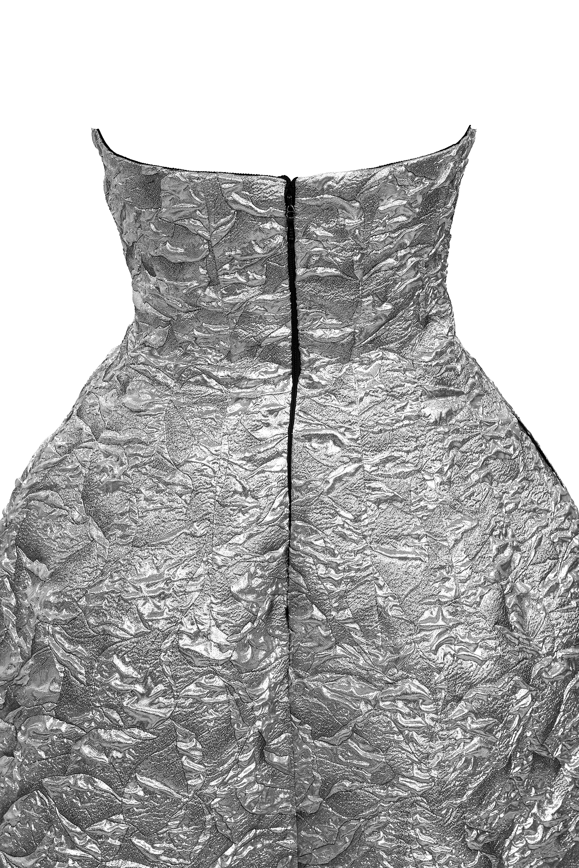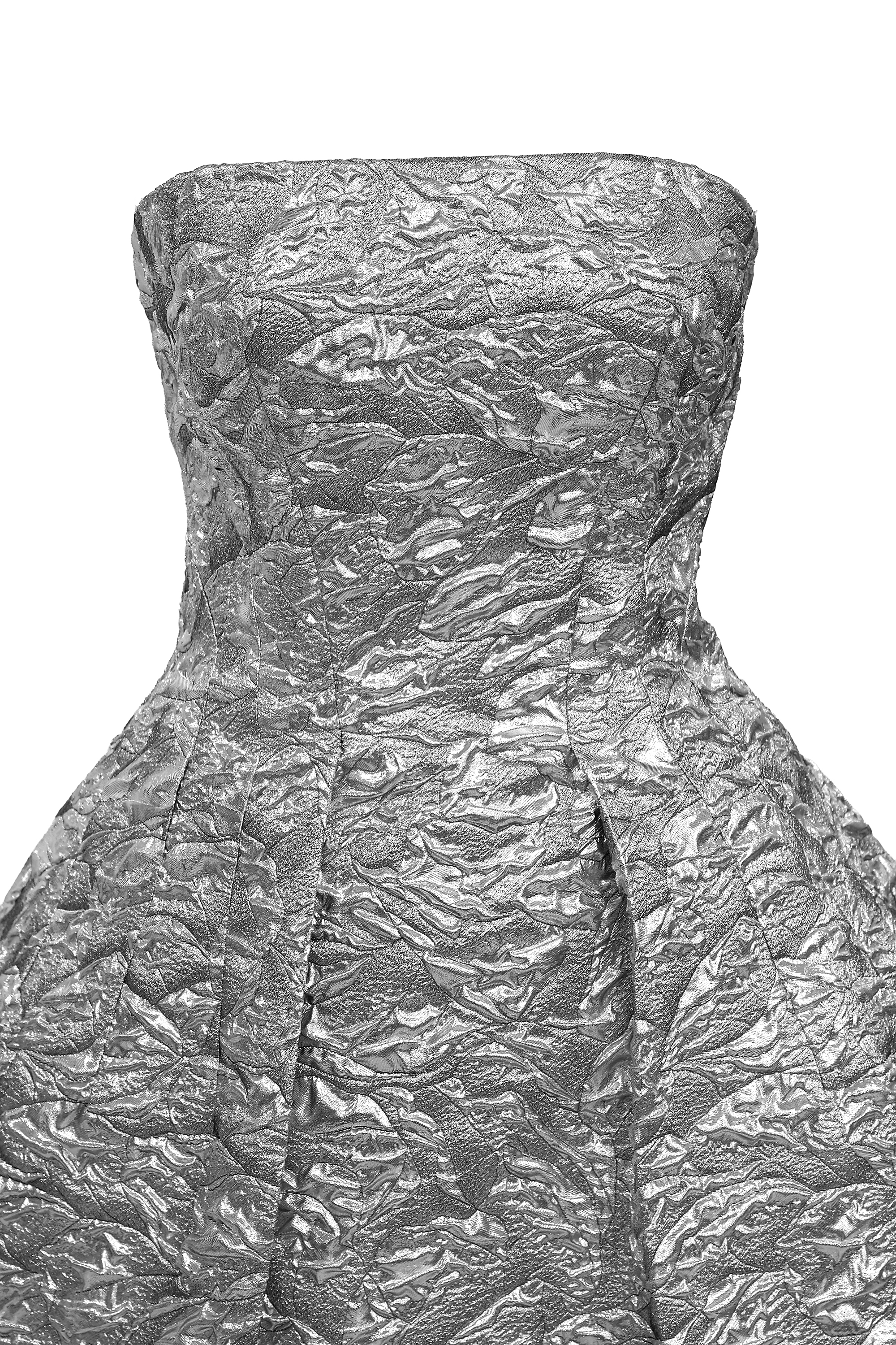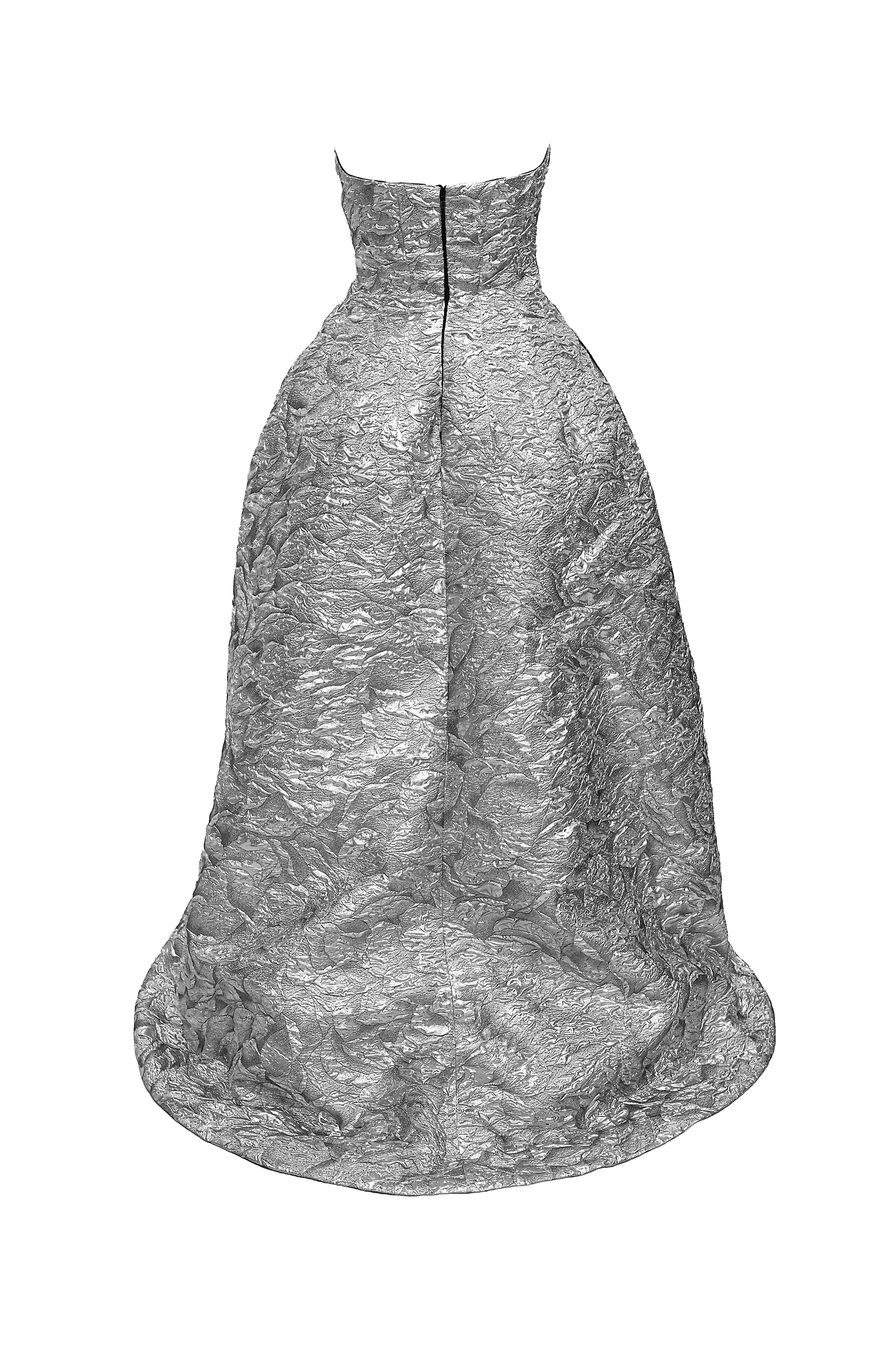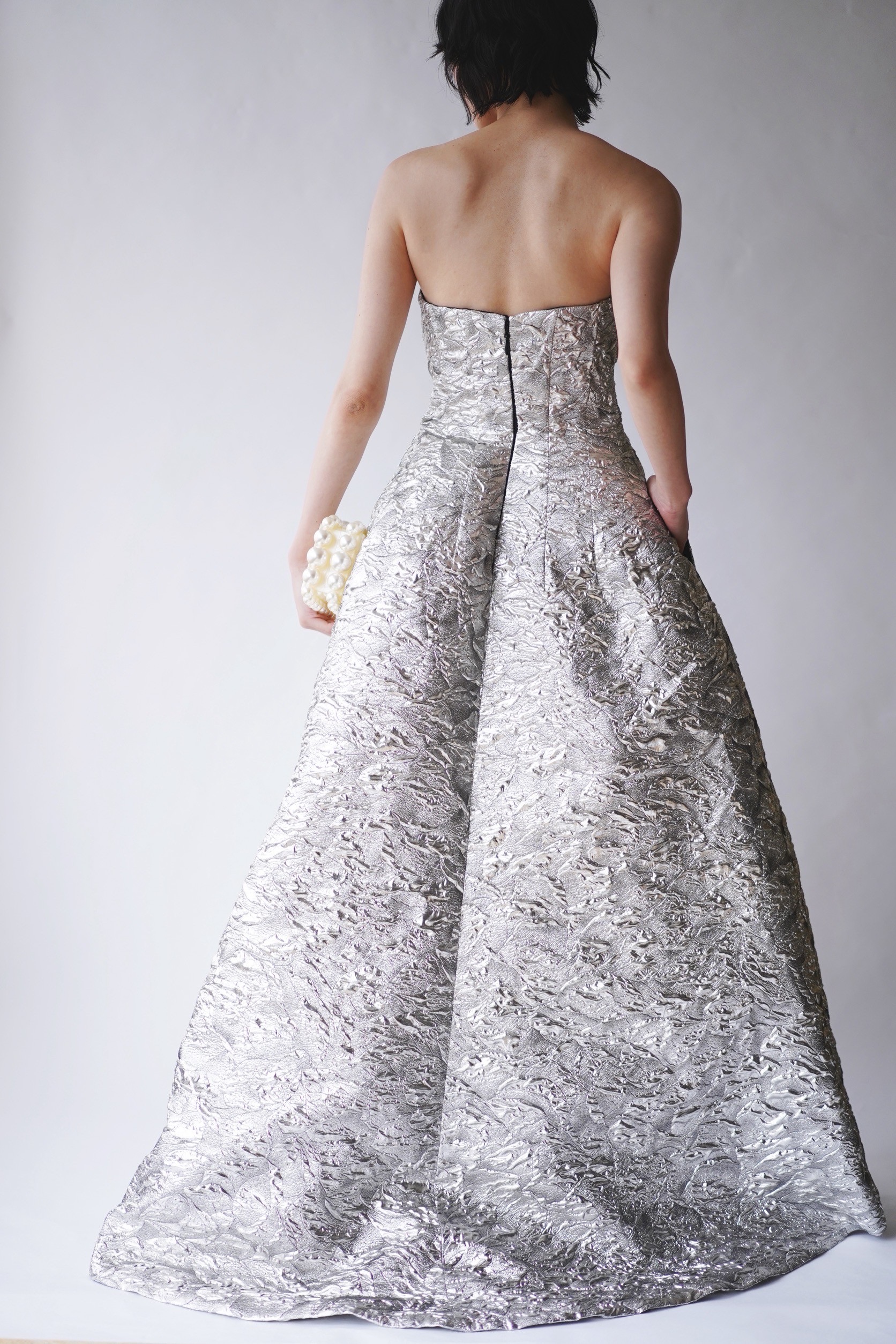 シルバーのメタリックジャガードが目を惹く1着。シルバーに輝くジャカード生地とリュクスなボリューム感が印象的で、記憶に残るドレスアップを叶えてくれます。ボディ部分は、しっかりとしたボーンと中ゴム入りの構築で、ストラップレスながらしっかりとしたホールド感があり安心感がございます。結婚式の二次会や前撮りのドレスとしても是非。