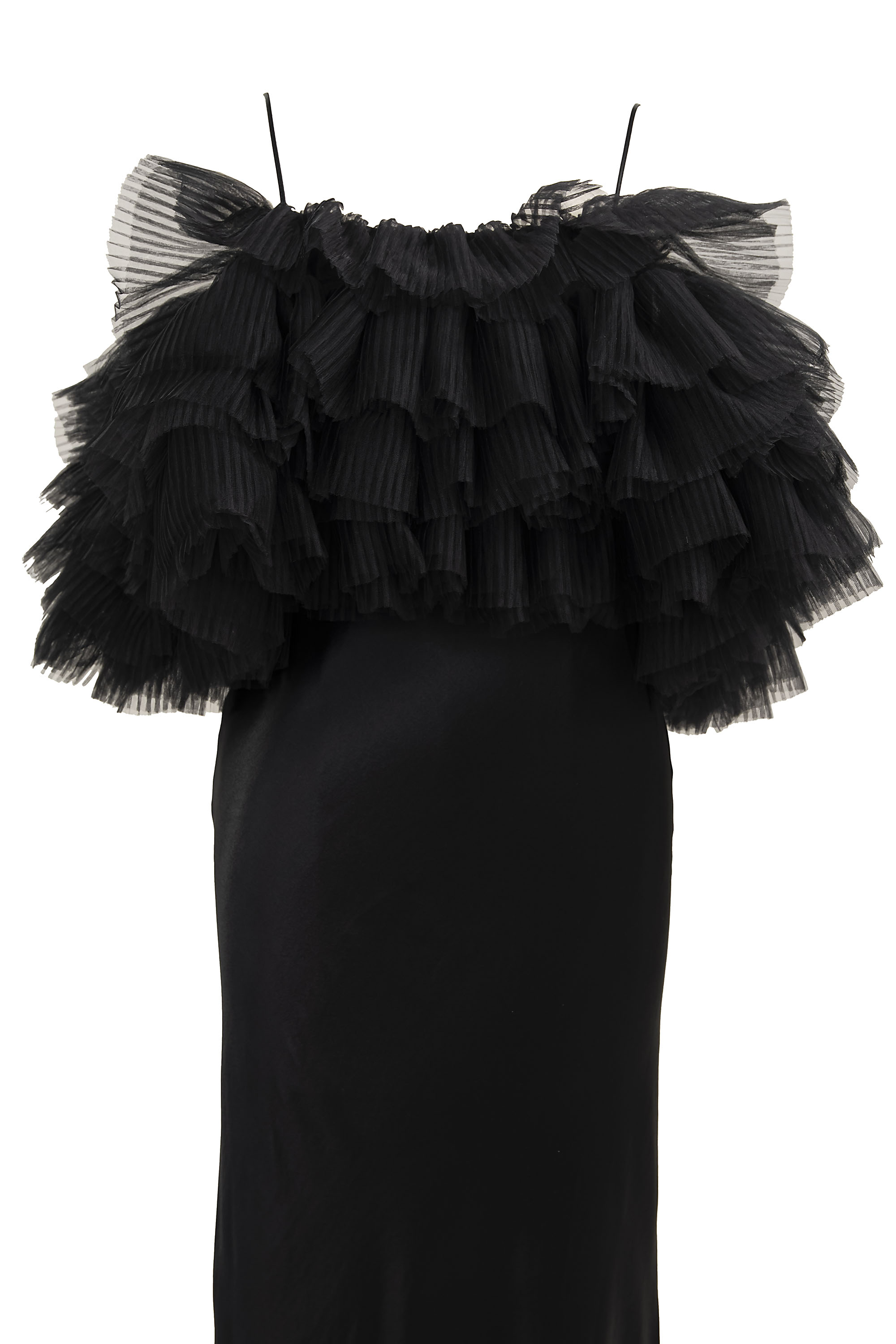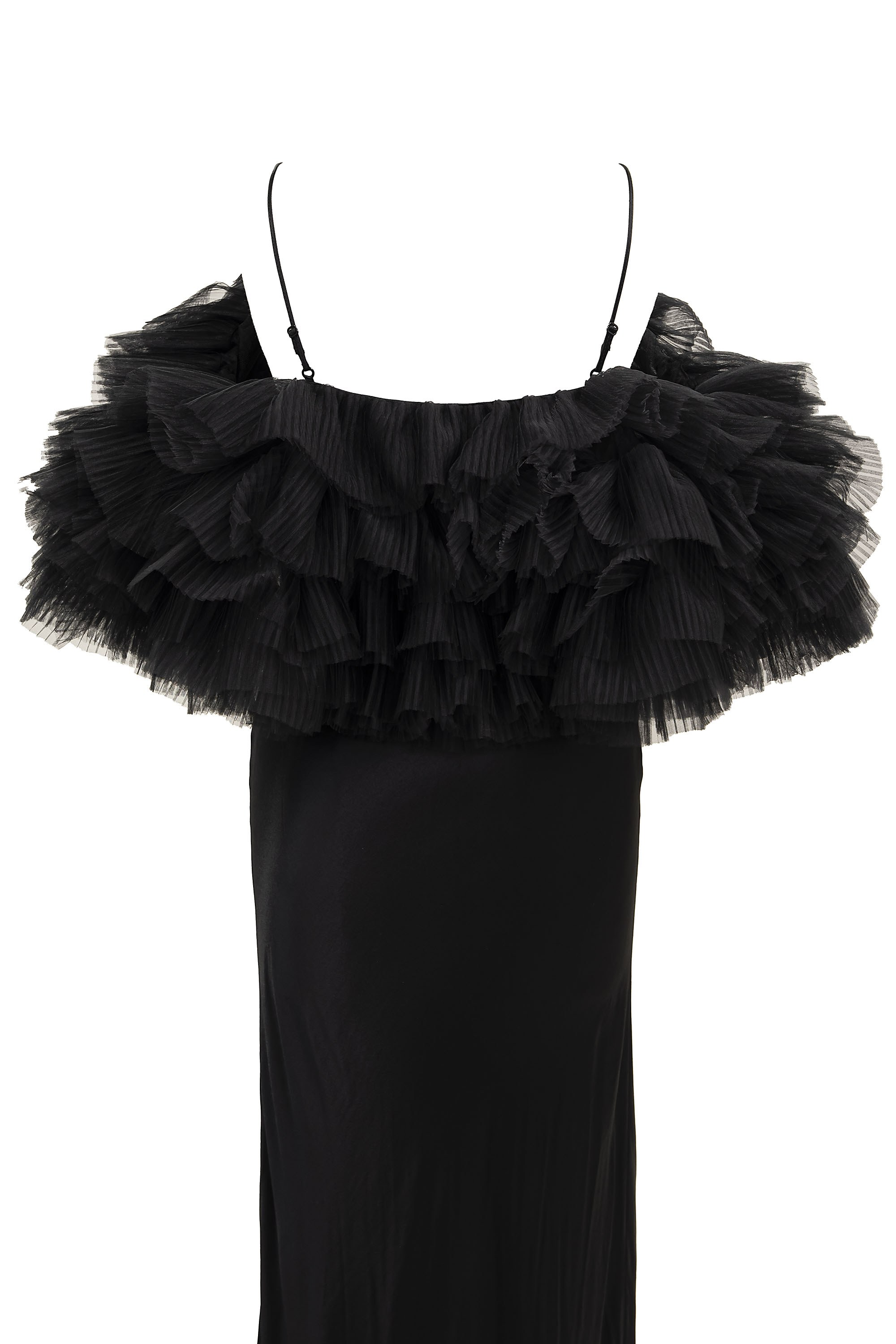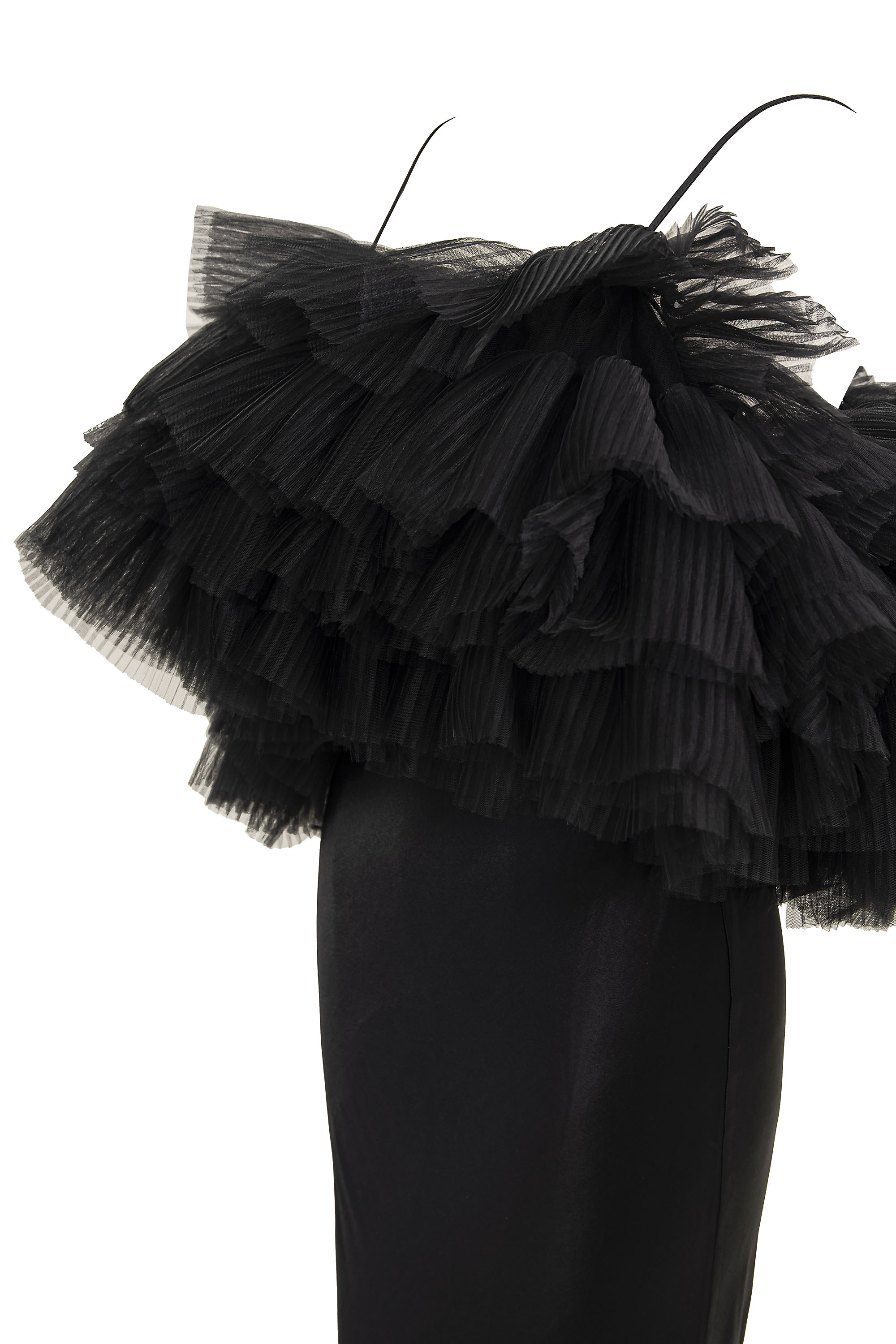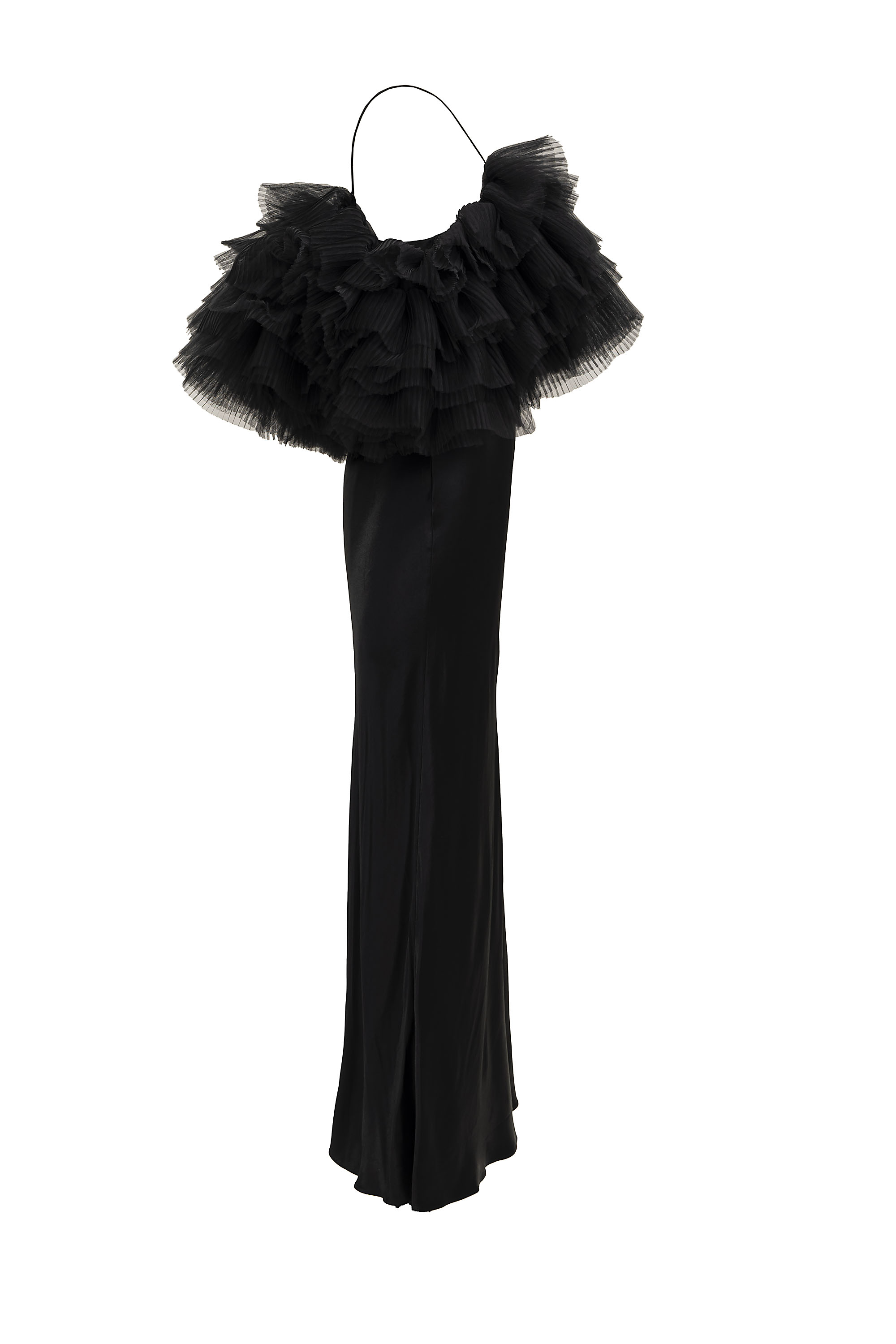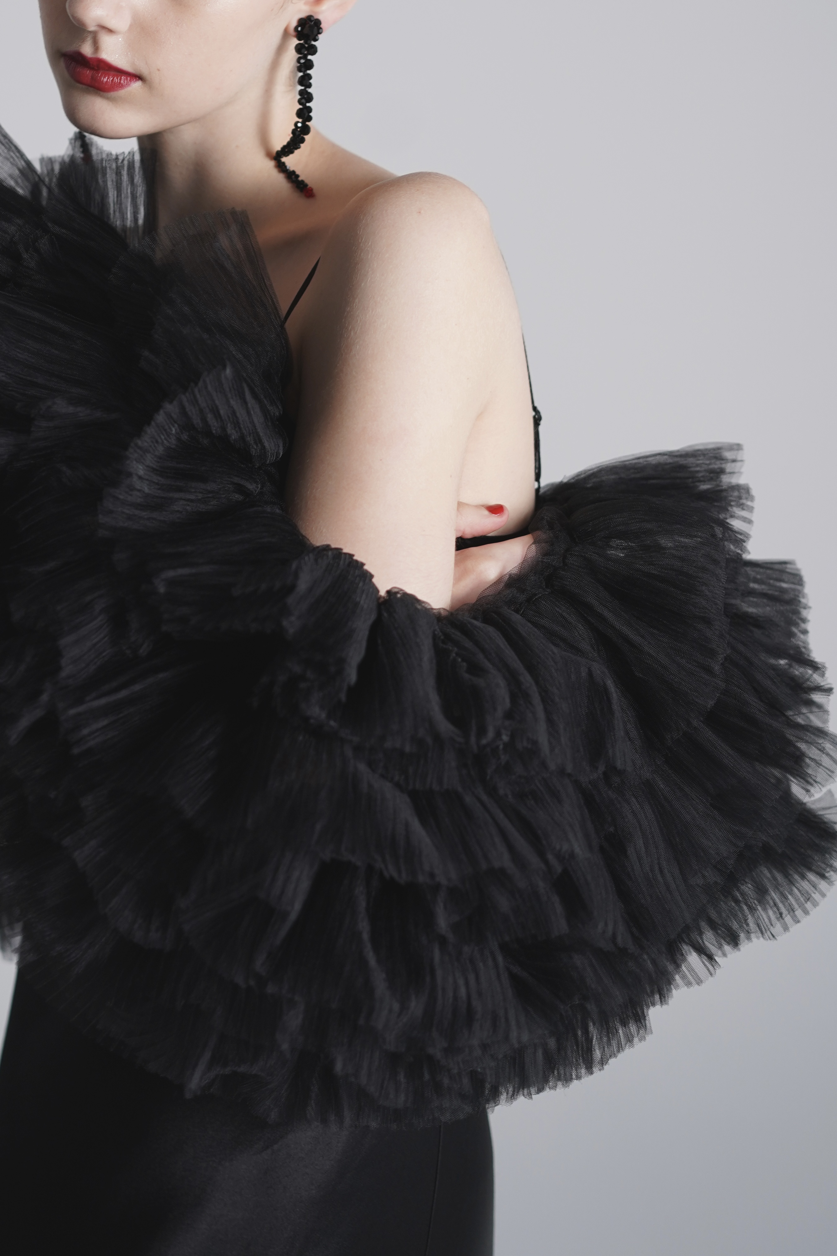 大注目の主役感ドレス。結婚式の2次会やウェディングフォトにもおすすめの1着。肩のスパゲッティストラップがデコルテを華奢に見せてくれ、ビックボリュームのチュールオフショルダーはウエストラインを綺麗に演出いたします。