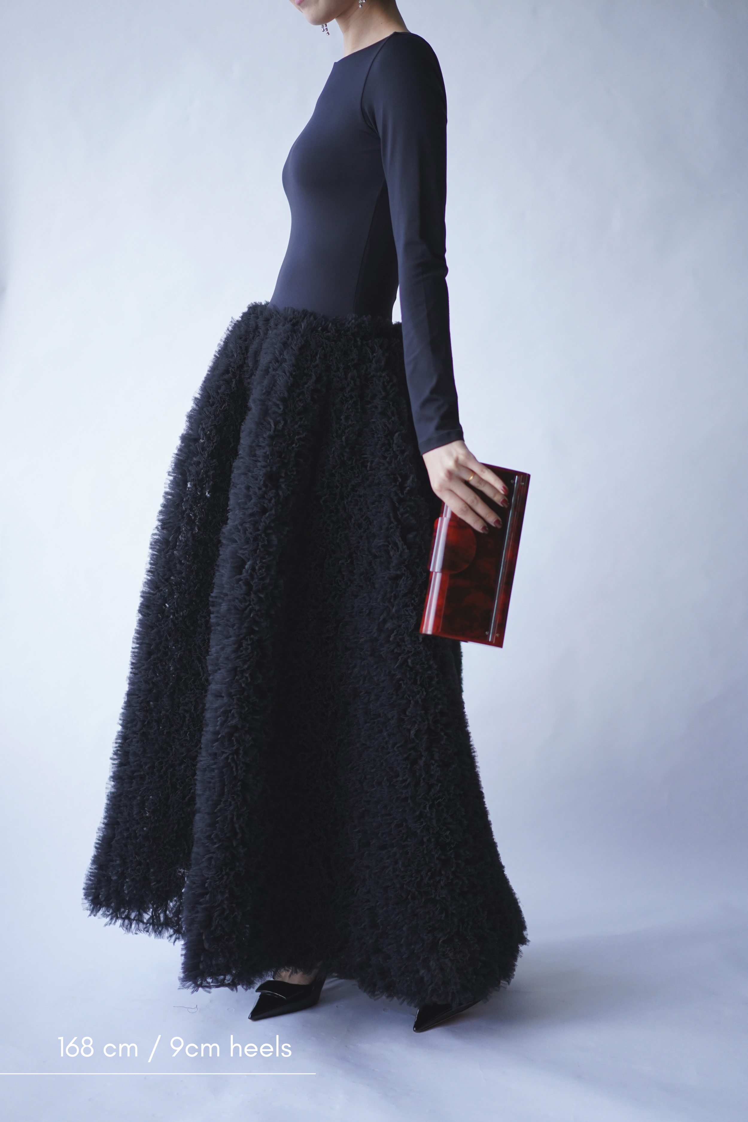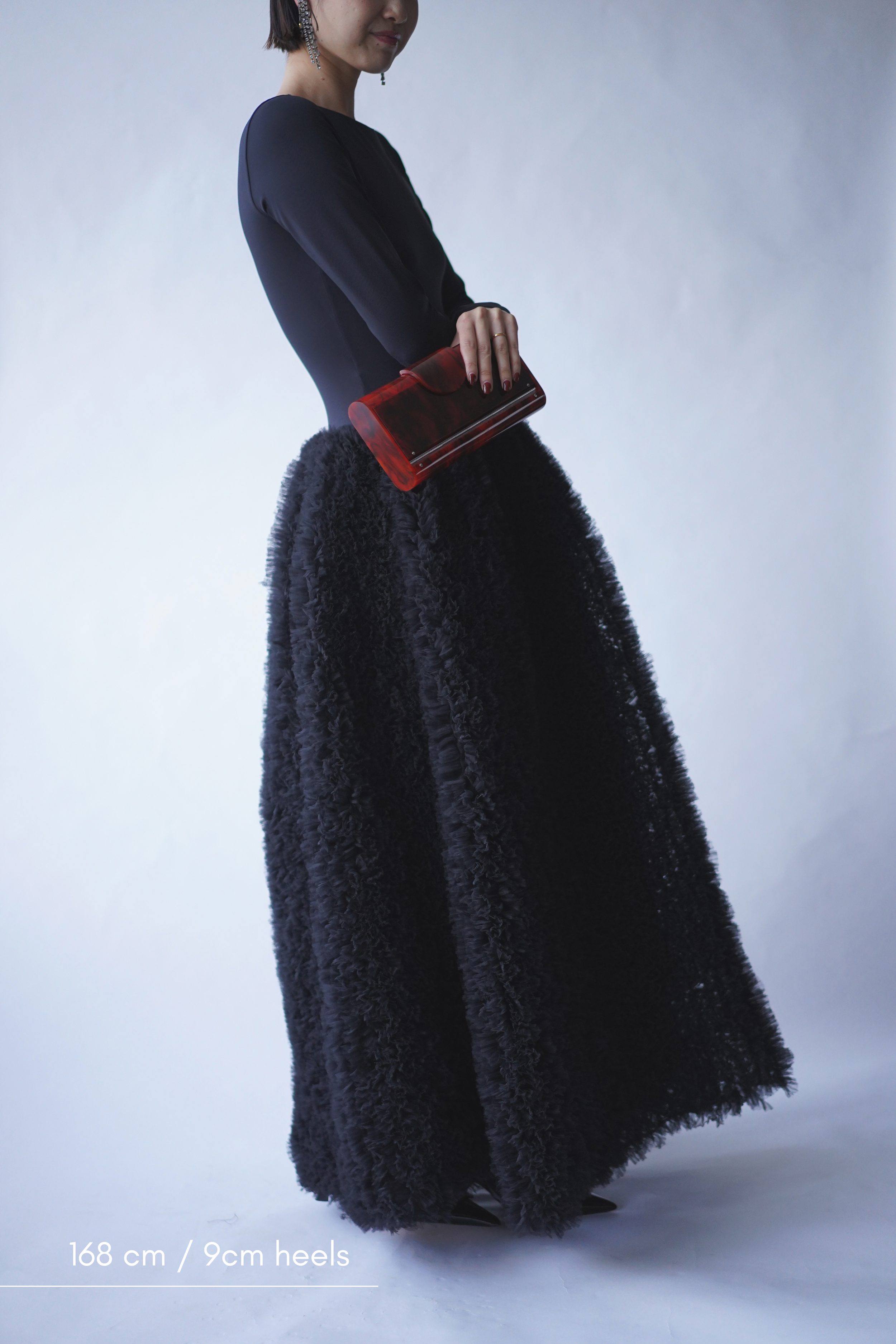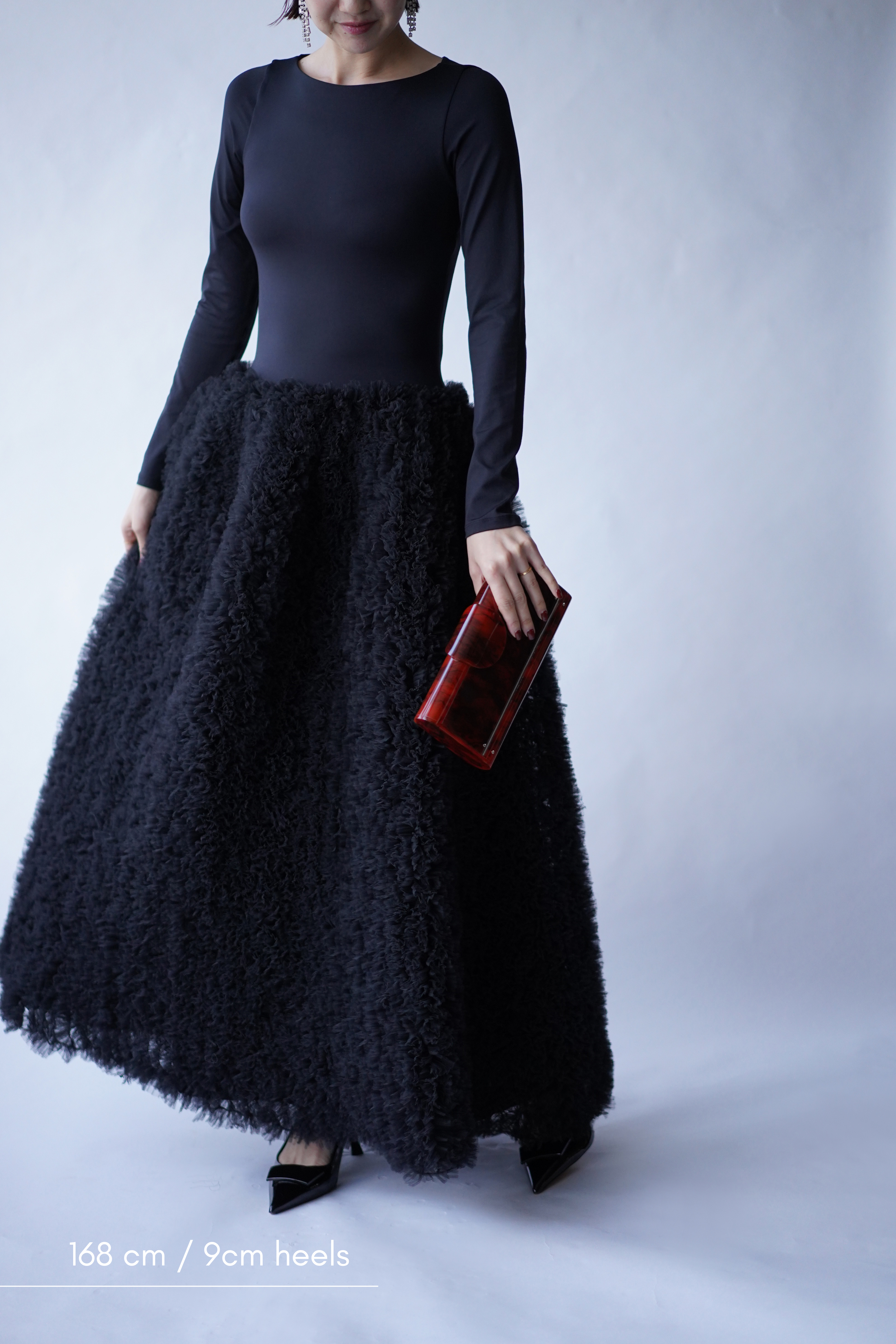 ドラマチックなチュールスカートとミニマルなブラックが描く、とっておきの一着。 モードなシルエットが、大人のワンランク上のドレスアップを叶えます。 モダンで洗練された「HAUTE的エレガンス」なスタイルを、この機会に挑戦してみては。