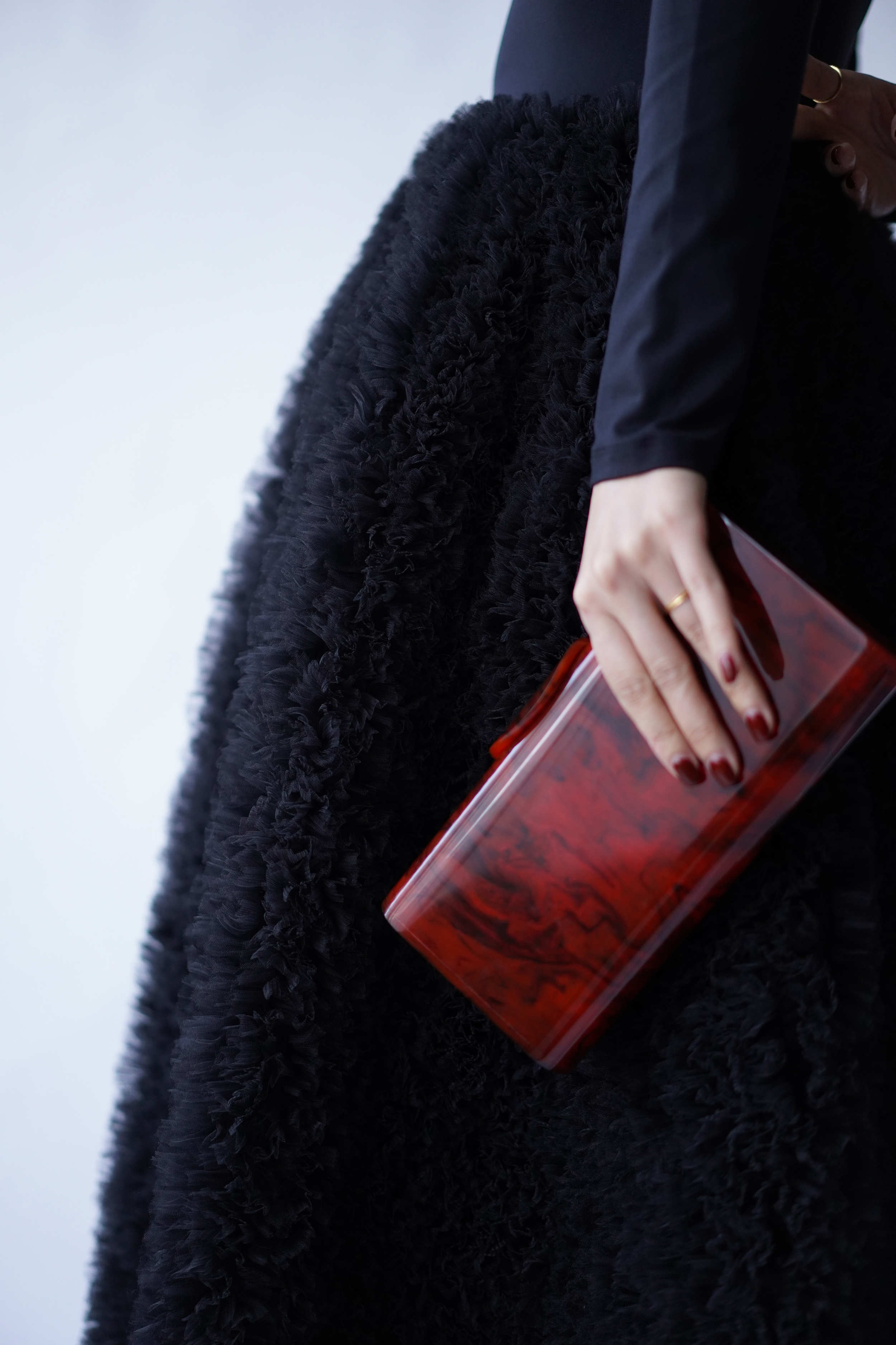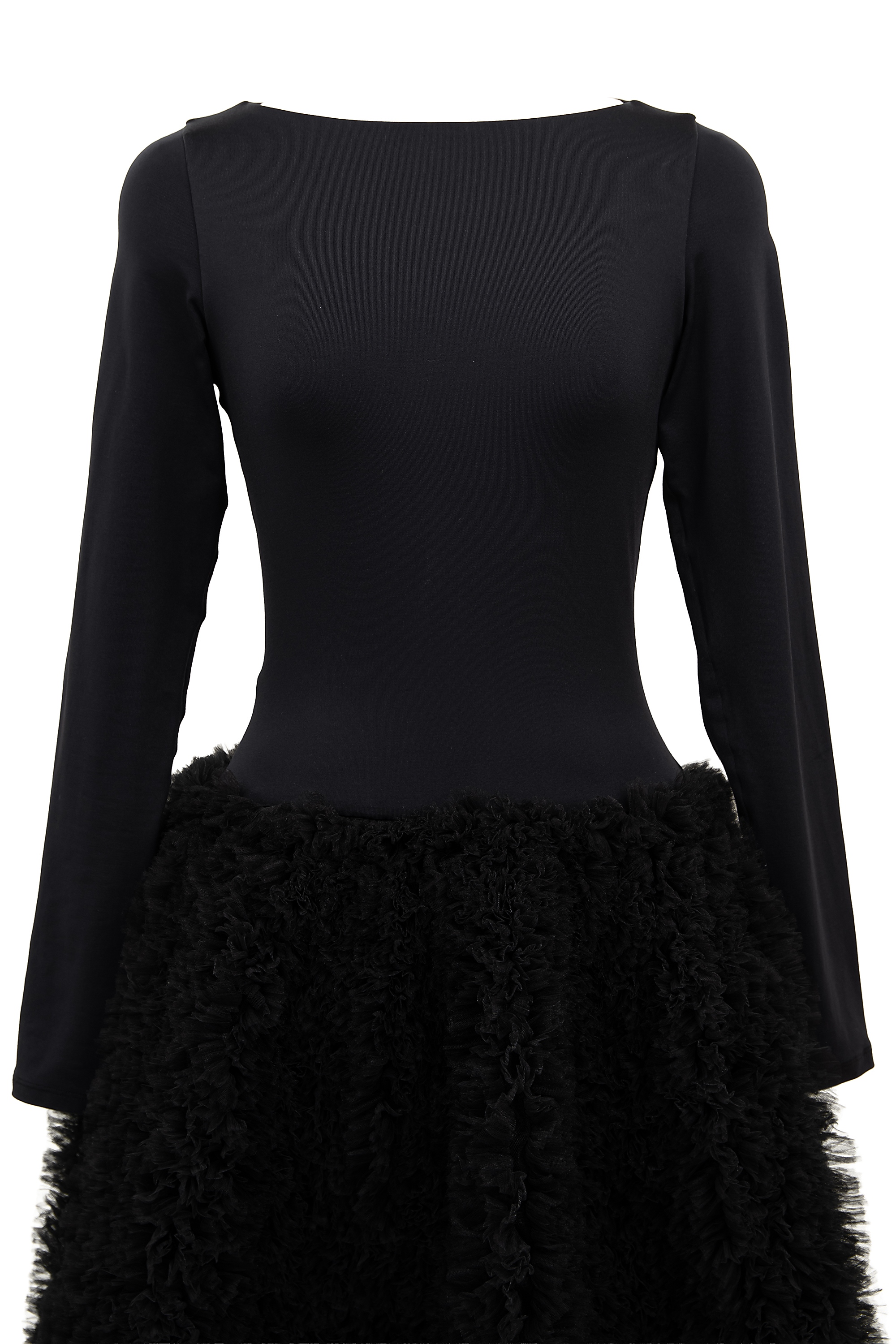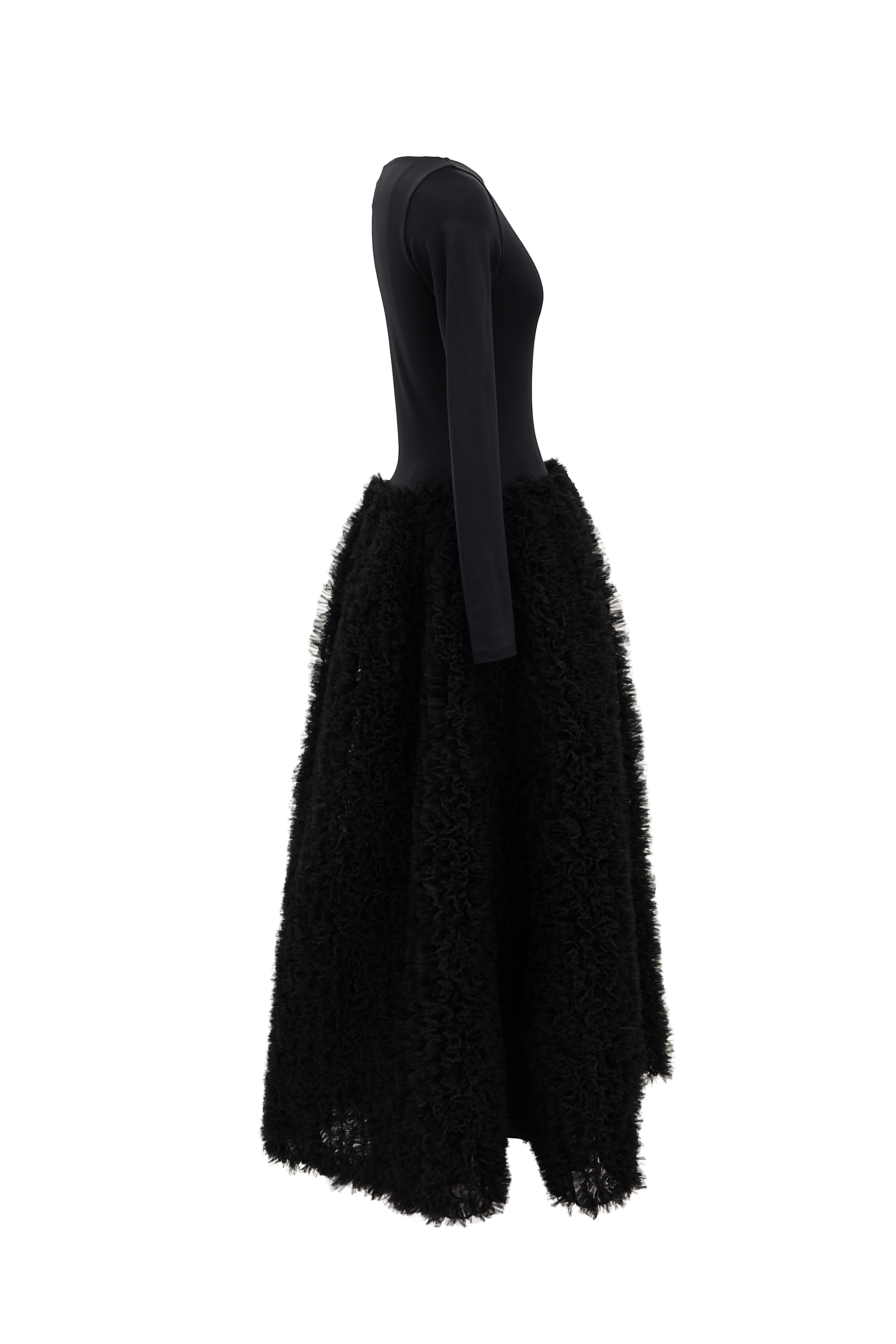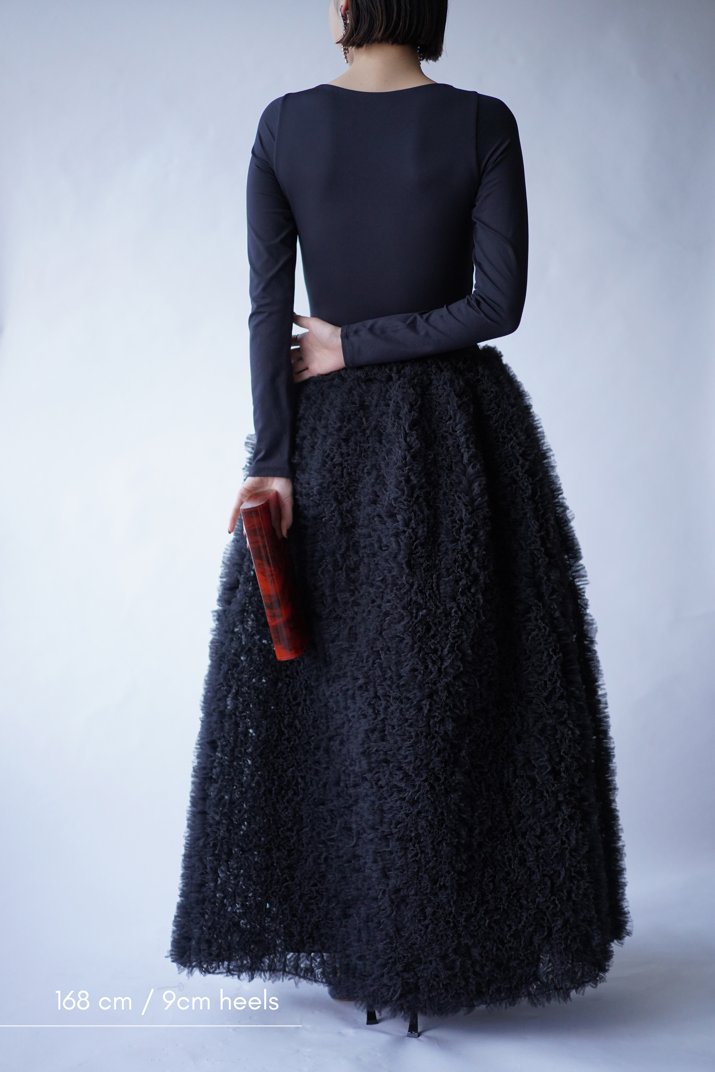 ドラマチックなチュールスカートとミニマルなブラックが描く、とっておきの一着。 モードなシルエットが、大人のワンランク上のドレスアップを叶えます。 モダンで洗練された「HAUTE的エレガンス」なスタイルを、この機会に挑戦してみては。